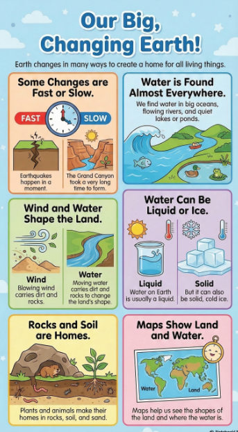In another example (below) I used the Earth’s Systems section from A Framework and asked that the infographic not go beyond the K – 2 grade band. This does a good job of summing up the grade 2 unit about fast and slow changes. Here is the prompt I used to restrain NotebookLM from going beyond the garde band, “Could you please create an infographic founded in this information that does not go beyond the K-2 grade band?.” I think it worked pretty well : ).
